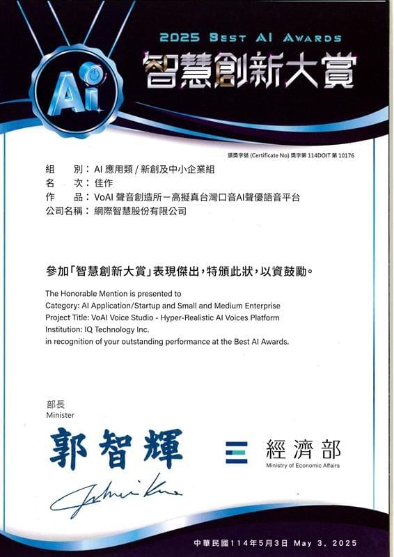 ★ 賀!VoAI 絕好聲創-聲音創造所 獲得 經濟部-智慧創新大賞 Best AI Awards